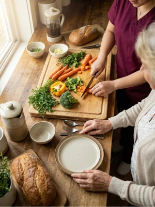 Meal preparation, cooking support, and feeding assistance tailored to dietary needs.